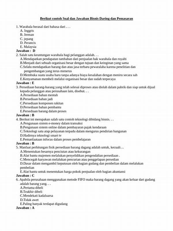 Dalam era globalisasi, soal P3K bisnis daring dan pemasaran menjadi sangat penting bagi para pelaku usaha untuk terus bertahan dan berkembang. Pembahasan tentang materi ini kerap kali melibatkan statistik, wawancara, dan penelitian mendalam untuk mengidentifikasi berbagai strategi dan solusi terbaik.